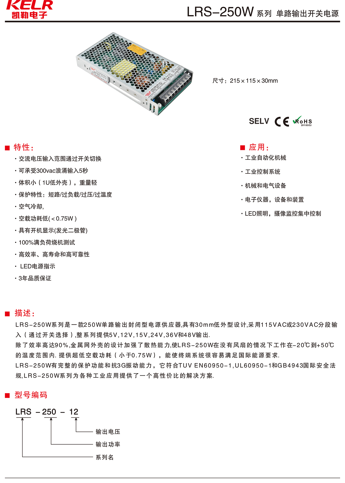 LRS-250-12 系列 單路輸出電源供應器
