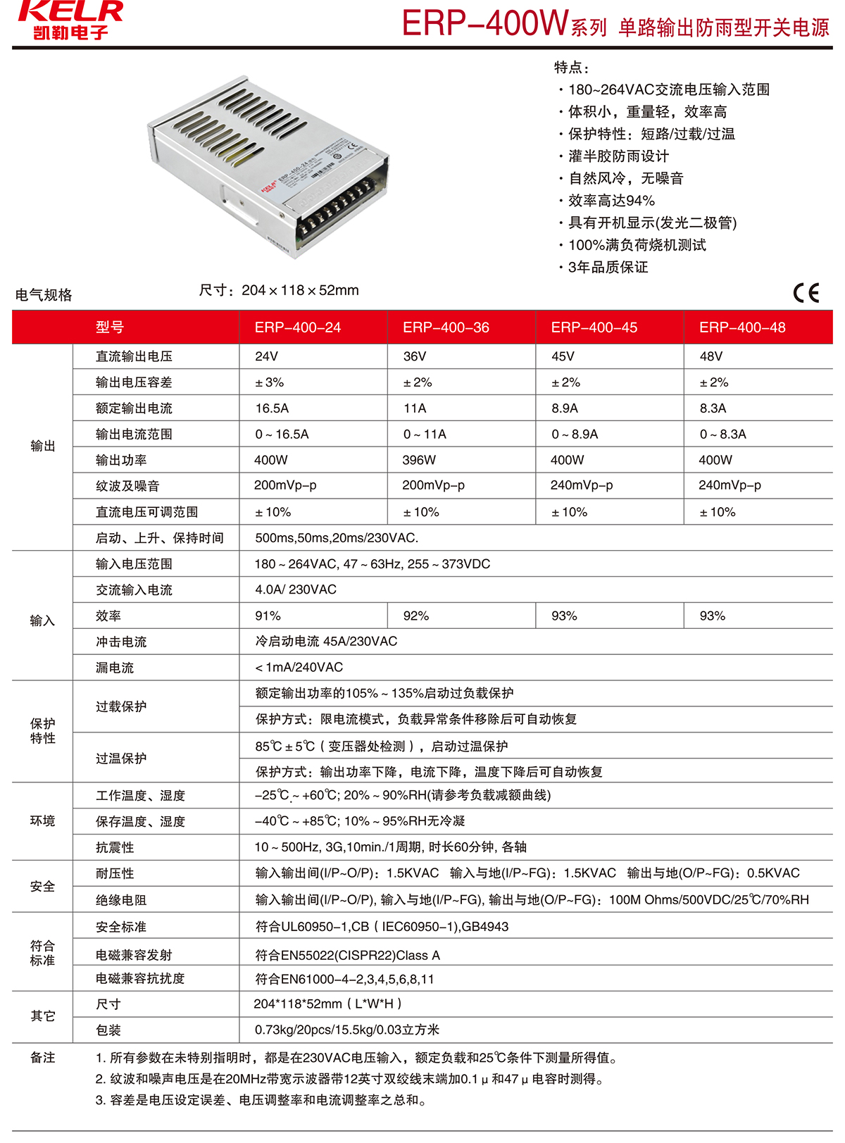 ERP-400-24 系列 單路輸出防雨型開關(guān)電源