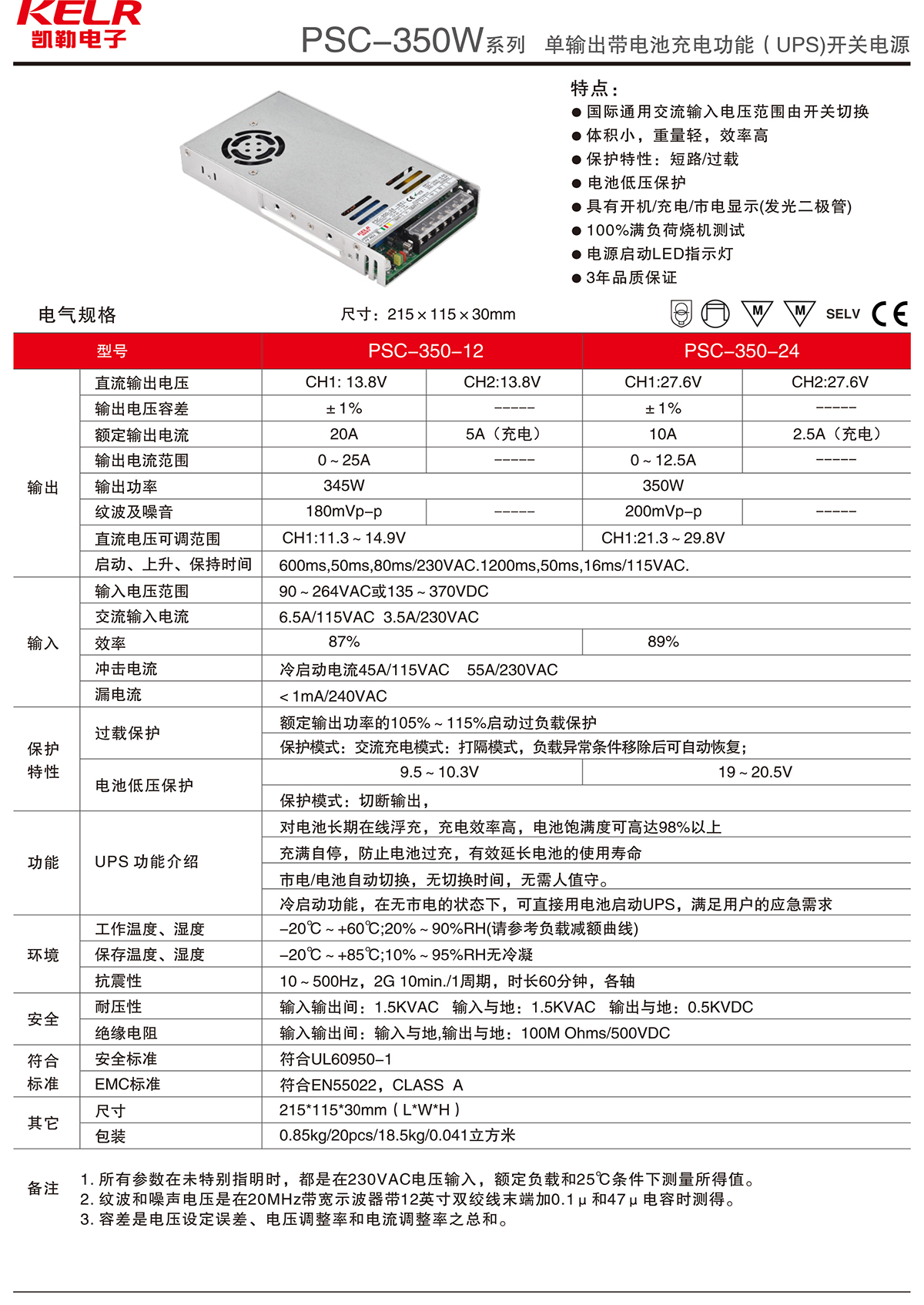 PSC-350W 系列 單輸出帶電池充電功能(UPS)開關(guān)電源